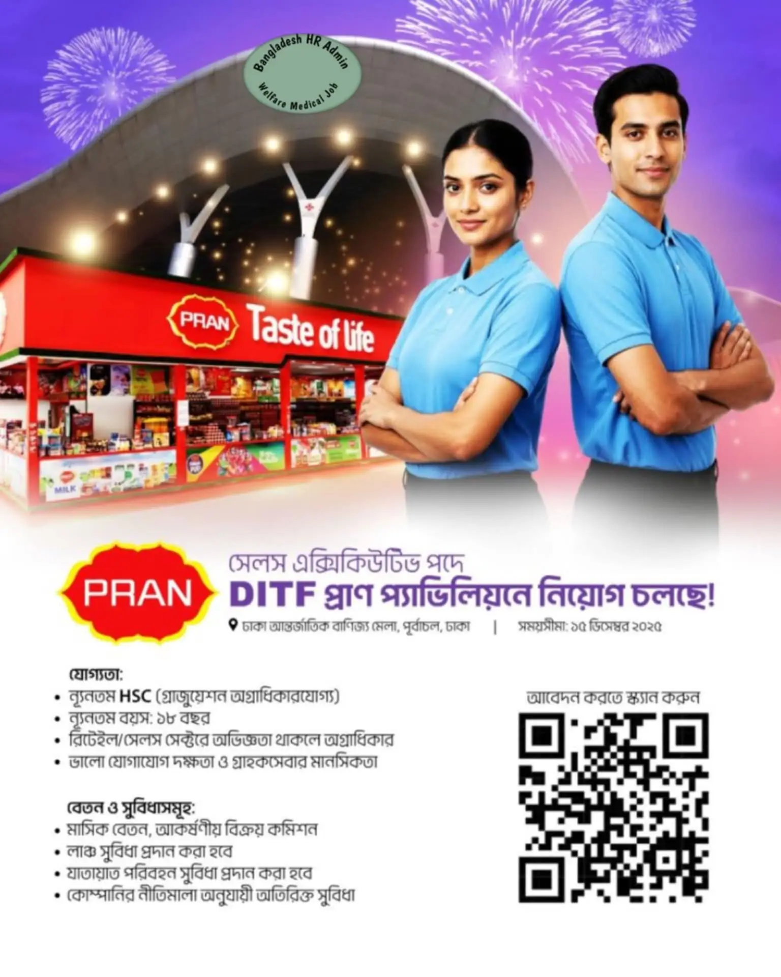 শীর্ষস্থানীয় শিল্পপ্রতিষ্ঠান প্রাণ গ্রুপে ‘সেলস এক্সিকিউটিভ’ পদে জনবল নিয়োগ দেওয়া হবে। আগ্রহীরা আগামী ১৫ ডিসেম্বর পর্যন্ত আবেদন করতে পারবেন। প্রার্থীকে অবশ্যই এইচএসসি পাস হতে হবে। তবে স্নাতক ডিগ্রিধারীদের অগ্রাধিকার দেওয়া হবে। ঢাকায় কাজ করার মানসিকতা থাকতে হবে। ১৮ বছর বয়স হলেই আবেদনের সুযোগ পাবেন।