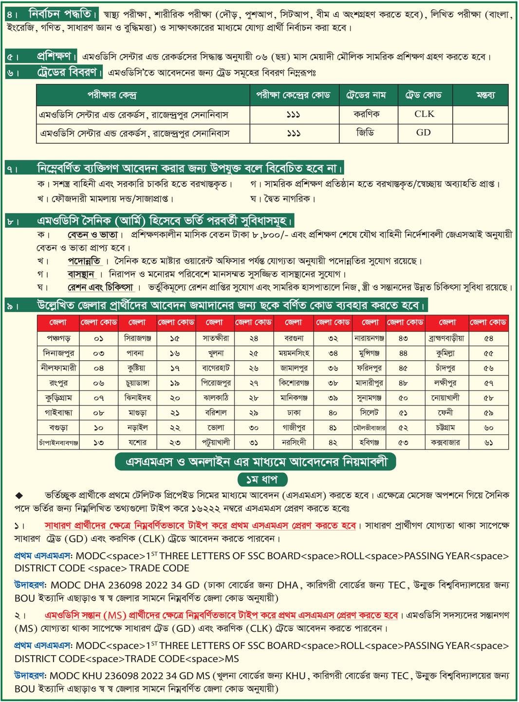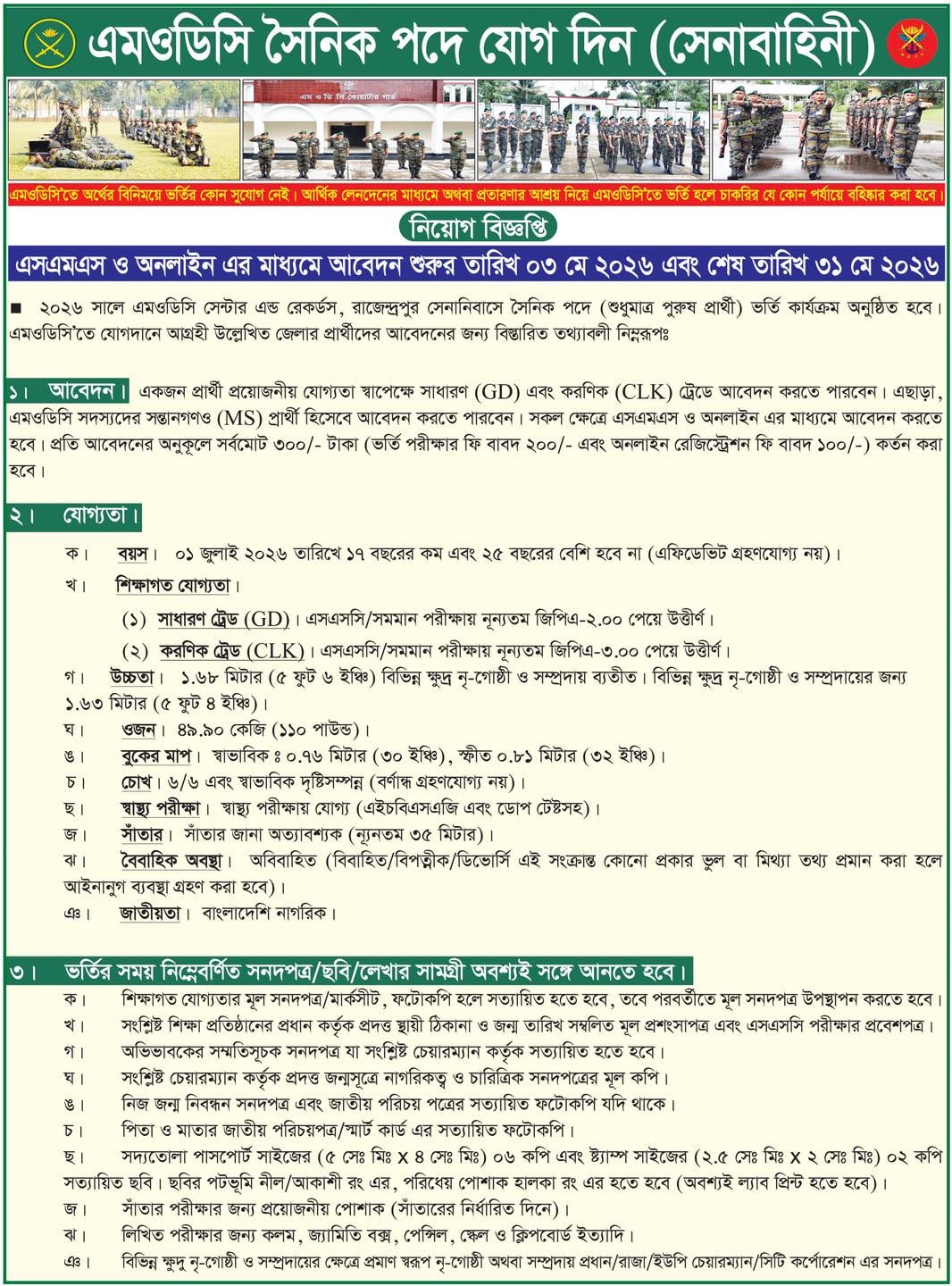 এমওডিসি সেন্টার এন্ড রেকর্ডস, রাজেন্দ্রপুর সেনানিবাসে এমওডিসি সৈনিক পদে (শুধুমাত্র পুরুষ প্রার্থী) ভর্তি কার্যক্রম অনুষ্ঠিত হবে। এসএমএস ও অনলাইনের মাধ্যমে আবেদন শুরু হবে আগামী ৩ মে ২০২৬। আবেদন করা যাবে আগামী ৩১ মে ২০২৬ পর্যন্ত।
